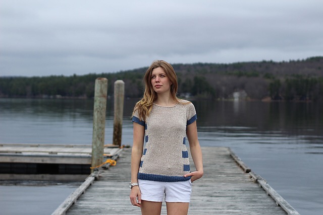 Bar Harbor is a short sleeve summer weight linen tee that knits up quickly in Aran weight linen. Alicia created the side stripes utilizing clever construction to avoid intarsia. This tee is worked top down, starting out working flat before joining in the round. After the sleeves are separated and fit is verified, the body is worked in four sections allowing for easy stripes. These pieces are then seamed together using mattress stitch before finishing the hemline in the round.